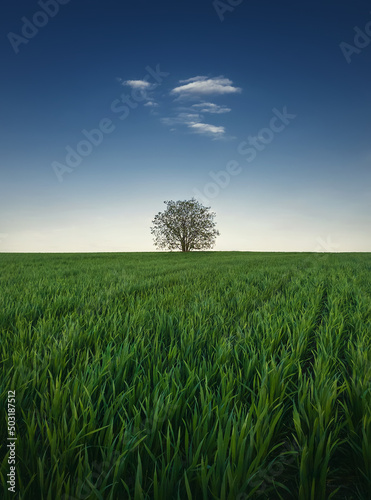 Lone tree in the growing wheat field. Idyllic minimalist background. Conceptual spring scene with green grass meadow and a single tiny cloud in the blue sky above the solitary tree
