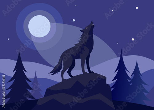 wolf, howling, moon, night, star, forest, tree, nature, wildlife, animal, silhouette, dark, blue, purple, landscape, illustration, vector, art, full, sky, lonely, wild, howl, moonlight, serene, peaceful, minimalist, stylised, glowing, winter