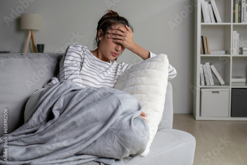 Lonely Asian woman in distress, worried, confused, lying on couch at home. Female suffer from mental health problems.