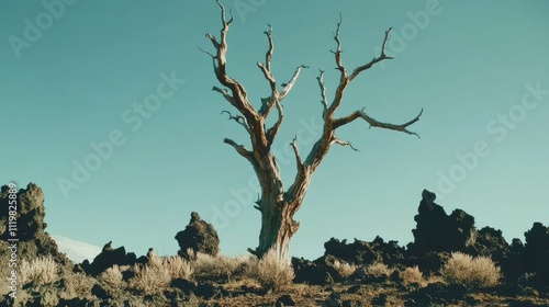 Lonely dead tree in a rocky landscape during winter against a clear blue sky showcasing nature's stark beauty and resilience.