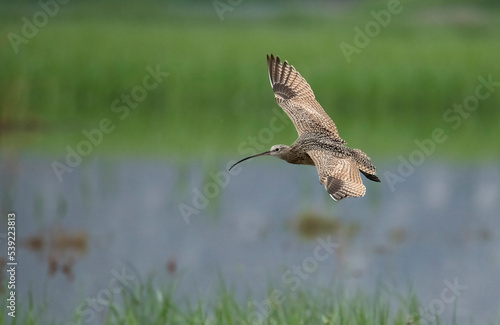 Long billed Curlew in low flight over pond and grass showing off beautiful brown and orange plumage and long bill up close