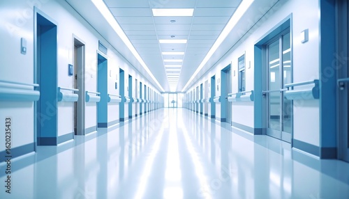 hospital, corridor, hallway, door, wall, sterile, clean, bright, light, blue, medicals, health care, perspective, vanishing, point, modern, interior, design, shiny, floor, line