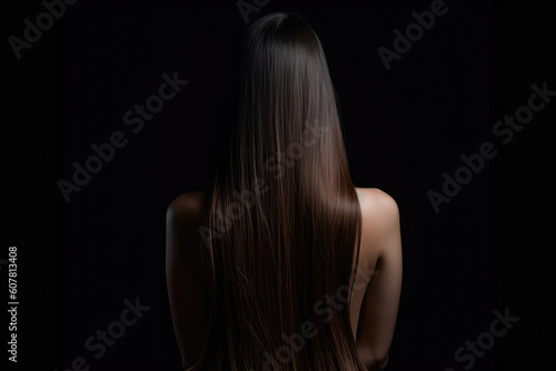 generative, ai, long, brunette, straight, hair, rear, view, black, background, cut, style, cut-out, glossy, smooth, tamed, curled, feminine, manage, layered, sleek, dye, subtile, bob, tress, volume, blowout, casual attire, shiny, length, parted, bun, frame, ponytail, pinned, thick, part, slick, cleaving, edge