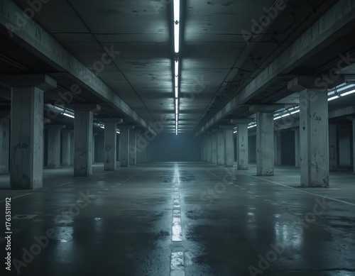 Long concrete garage interior extends into darkness. Fluorescent tubes cast pale glow on damp floor, pillars. Sense of isolation pervades empty space suggesting mystery foreboding. Unsettling