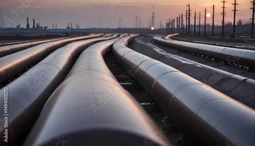 Long, curving pipelines leading towards industrial buildings under a hazy sky at dusk.