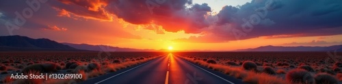 Long desert road disappearing into sunset, dramatic sky , sky, USA