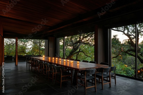 Long dining table, forest view, candlelit dinner, luxury resort