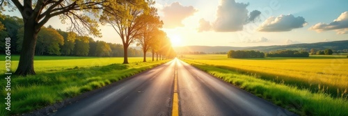 Long, empty asphalt road disappearing into a sunlit spring countryside , linear, beautiful, countryside