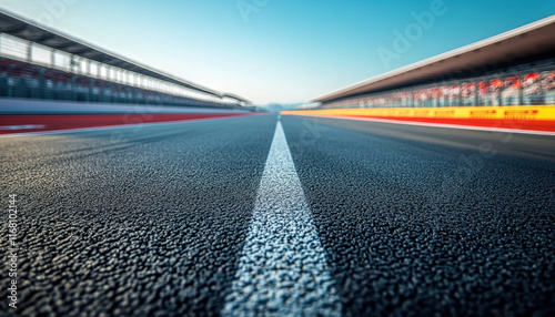 long empty tarmac road on Formula 1 race track, showcasing smooth asphalt surface and vibrant surroundings, evokes sense of speed and anticipation