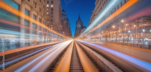 Long exposure of a commuter route with public transportation in a large city for inner-city transport of passengers at night