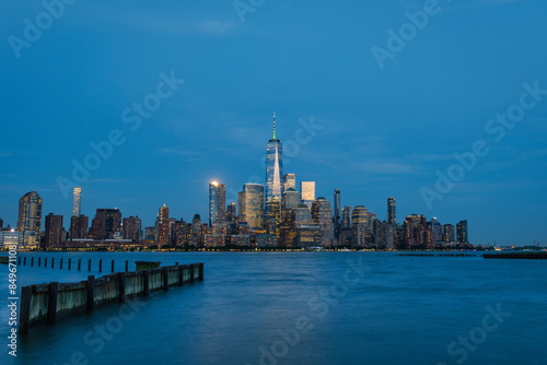 Long exposure of the Manhattan skyline viewed from Hoboken, New Jersey, at dusk.