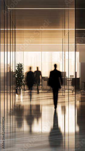 Long exposure shot of crowd of business people walking in bright office lobby fast moving with blurry