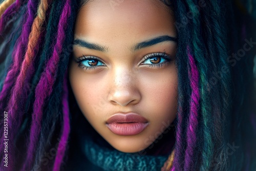 Long haircut - multicolored hair. Commercial promotion visual idea. Stunning calm mixed-race girl - for ads, advertisement and digital use. Long colored inspiration. African beauty artistic.