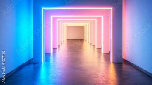 Long hallway with neon lights that are in different colors. The hallway is very long and it seems to be a part of a building. The neon lights give the hallway a futuristic and modern look