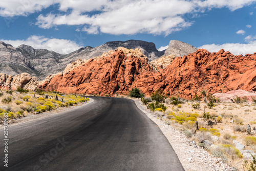 Long narrow road leading to red rocks of Red Rock Canyon.