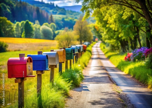 Long Row of Colorful Letterboxes Lining a Scenic Rural Road Surrounded by Greenery and Nature