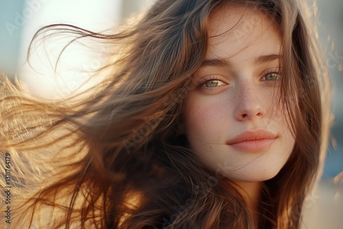 Long, shiny hair flows gently in the wind as soft golden hour sunlight creates warm highlights, enhancing the woman's dreamlike beauty on a serene evening