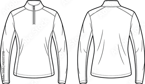 Long sleeve pullover top, half zip collar design, technical flat sketch, athletic sportswear, fashion vector template, sweatshirt illustration drawing