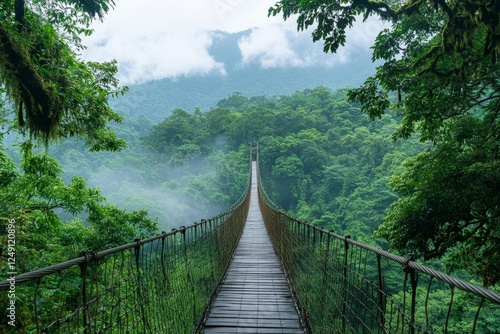 suspension, bridge, rainforest, fog, mist, tropical, forest, jungle, wooden, adventure, nature, hiking, landscape, green, footbridge, pathway, rope, mountain, wilderness, exploration, travel, outdoors, canopy, morning, paseo, atmospheric, environment, natural, scenic, vacation, tour tourism, perspective, crossing