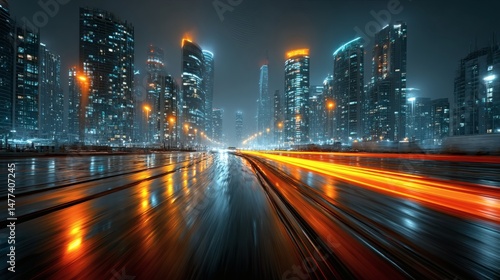 Long-exposure scene of a digital-age city with light trails weaving through skyscrapers
