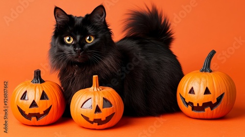 Long-haired black cat with orange pumpkins on Halloween orange color background with copy space