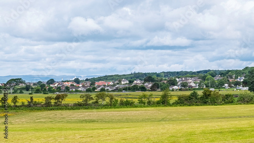 Looking over the fields and hedges to the town of Troon and Loans in the far distance in South Ayrshire Scotland