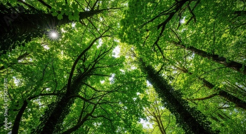 forest, tree, canopy, nature, green, leaf, sunlight, timberland, outdoors, foliage, branch, tall, lush, dense, growth, natural, ecosystem, environment, serene, peaceful, tranquil, vibrant, overhead, upward, sky