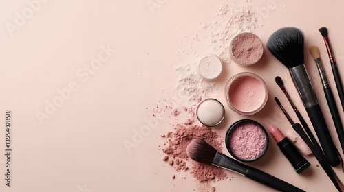 Loose powder, blush, and makeup brushes arranged on a soft pink background, concept for beauty blog, makeup tutorial, cosmetic product advertising