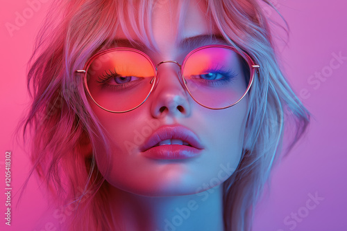 woman, portrait, blond, shaggy, mullet, sunglasses, pink, trendy, fashion, vibrant, retro, 80s, neon, cool, stylish, coiffure, beauty, edgy, chic, youthful, bold, eyewear, colourful