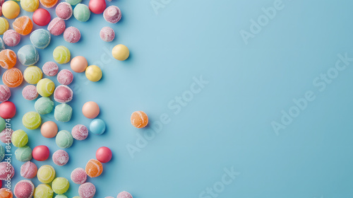lots of round candies on top on a blue background. international childrens Day. copy space. free space for text