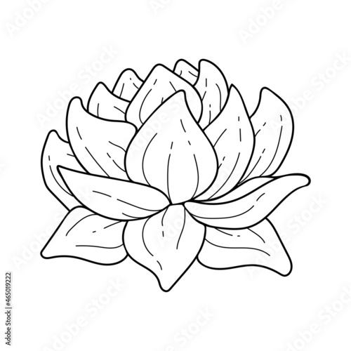 Lotus flower line art. Beautiful contour sketch of an exotic plant bud. Hand drawn vector illustration. Floral element for logo design.