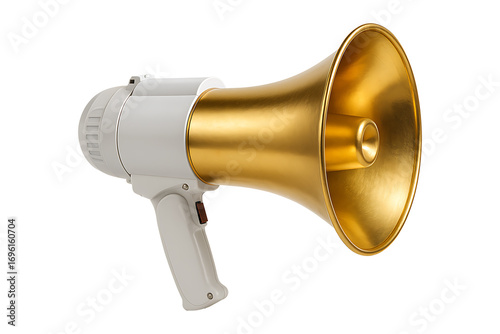megaphone, loudspeaker, communication, announcement, sound, gold, audio, noise, message, amplifier, technology, broadcast, metallic, alert, promotion, white, voice, signal, protest, marketing, advertising, speaker, object, device, instrument, event
