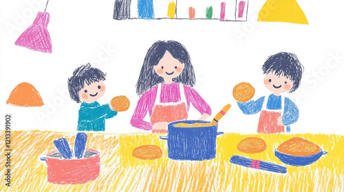 interaction, warmth, sharing, family, cooking, imagination, harmony, playful, bonding, teamwork, exploration, learning, tradition, vibrant, friendship, laughter, creativity, mother, joy, play, together, smile, children, ingredient, nurture, happiness, activity, utensil, love, fun, receipe, hand-made, mixing, kitchen, happy, home, snack, art, childhood, baking, meal, colourful, cookie, culture, food