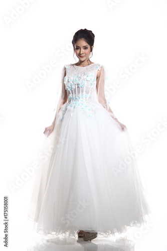 Lovely Asian Beautiful Woman bride in white wedding gown dress with lace, black hair