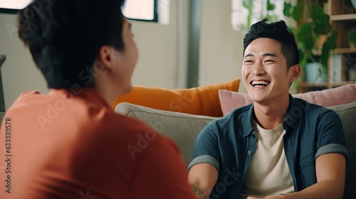 lovely asian couple lgbtq smiling positive conversation sit on sofa together embrace enjoy wekend moment relationship carefree morning lifestyle at home,ai generate