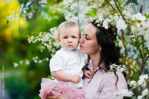 Lovely beautiful feminine mom with her daughter in her arms in spring with cherry blossoms. female natural beauty and beautiful wavy hair. Young European woman in a dress with a baby in a skirt.