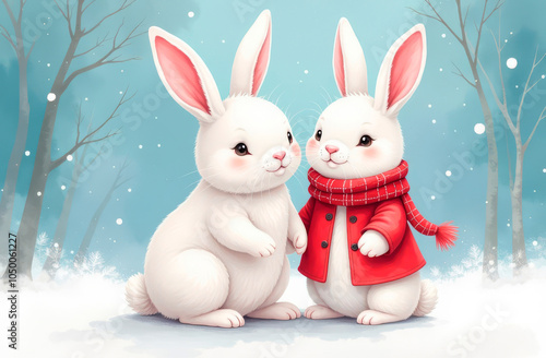 rabbit, cute, jacket, red, blue, white, snow, snowfall, forest, winter, holiday, new year, christmas, december, animal, green, illustration, rabbit, animal, celebration, baby, rabbit, christmas, new, year