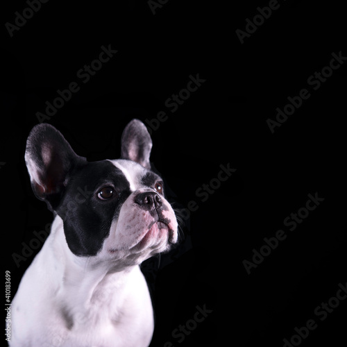 Lovely young black and white french bulldog looking on the side. portrait dog with black background
