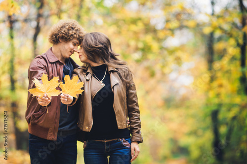 Loving happy couple in autumn in park holding autumn maple leaves in hands.