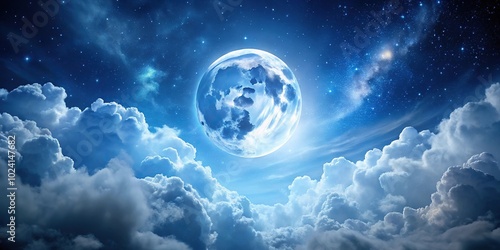 Low angle full moon with white clouds and stars in night sky filtered in blue tone
