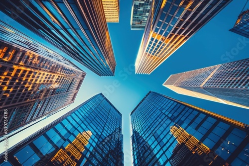 Low angle photo of skyscrapers in downtown, blue sky, looking up from street level.