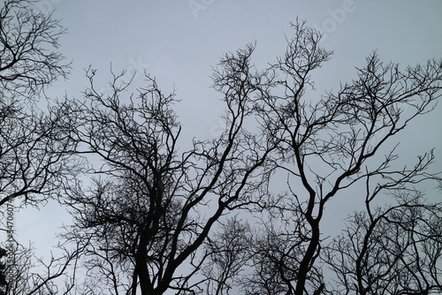Low angle shot of the bare tree againts the white cloud. The bare branch from the low view. Leaf less.