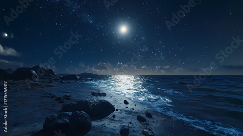 low, angle, view, galactic, shore, meeting, sea, serene, cosmic, landscape, illustration