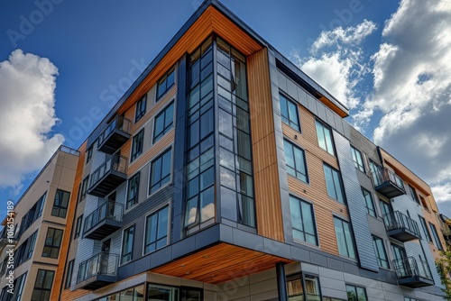 low, angle, view, modern, residential, building, architecture, exterior, design, structure, facades, contemporary, urban, sky, cloud, geometric, line, window, wood, metal, photographic, image, background, detailed, sunlight, clean, living, community, investment, property, aesthetic, home, city, environment, innovative, housing, layout, perspective, balance, symmetry, nature, urbanisation, high-coloured, inviting