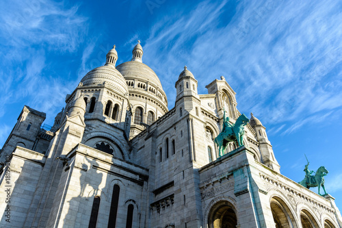 Low angle view of the Basilica of the Sacred Heart of Paris with the two equestrian bronze statues overhanging the portico against blue sky.