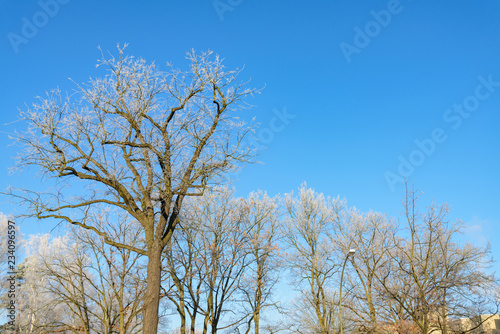 Low angle view of top of tree's twig and branch without leaves and covered with sunny with blue sunny sky background.