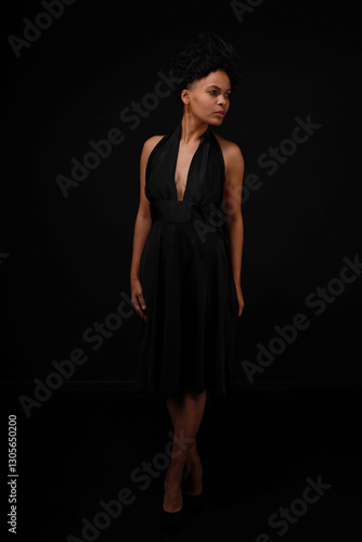 charming, full body, curly, shoulder, beautiful woman, sensuality, sensual, femininity, vogue, lady, gorgeous, posing, fashion, skin, black, fashionable, stylish, studio, beauty, young, caucasian, cute, beautiful, hair, white, model, female, pretty, attractive, girl, elegance, face, background, person, vintage, style, adult, make-up, dress, black-and-white, elegant, sexy, 1, glamour, woman, black dress, low key, portrait