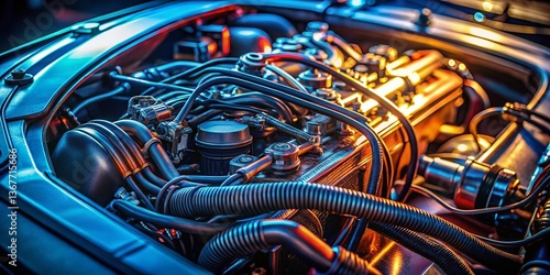 Low Light Car Engine Detail: Close-up of Wires and Cables