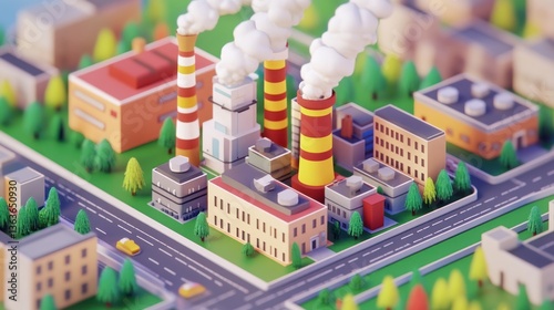 city, factory, emission, pollution, three-dimensional, illustration, urban, landscape, building, environment, industrial, smokestack, clean, air, ecology, sustainable, nature, eco, green, modern, model, colourful, design, art, digital, view, perspective, concept, architecture, business, industry, technology, graphic, geometric