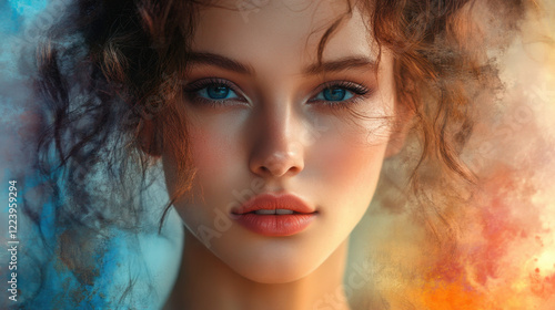 low saturated portrait of smart, beautiful lady with curly hair and striking blue eyes, surrounded by colorful, artistic background that enhances her features